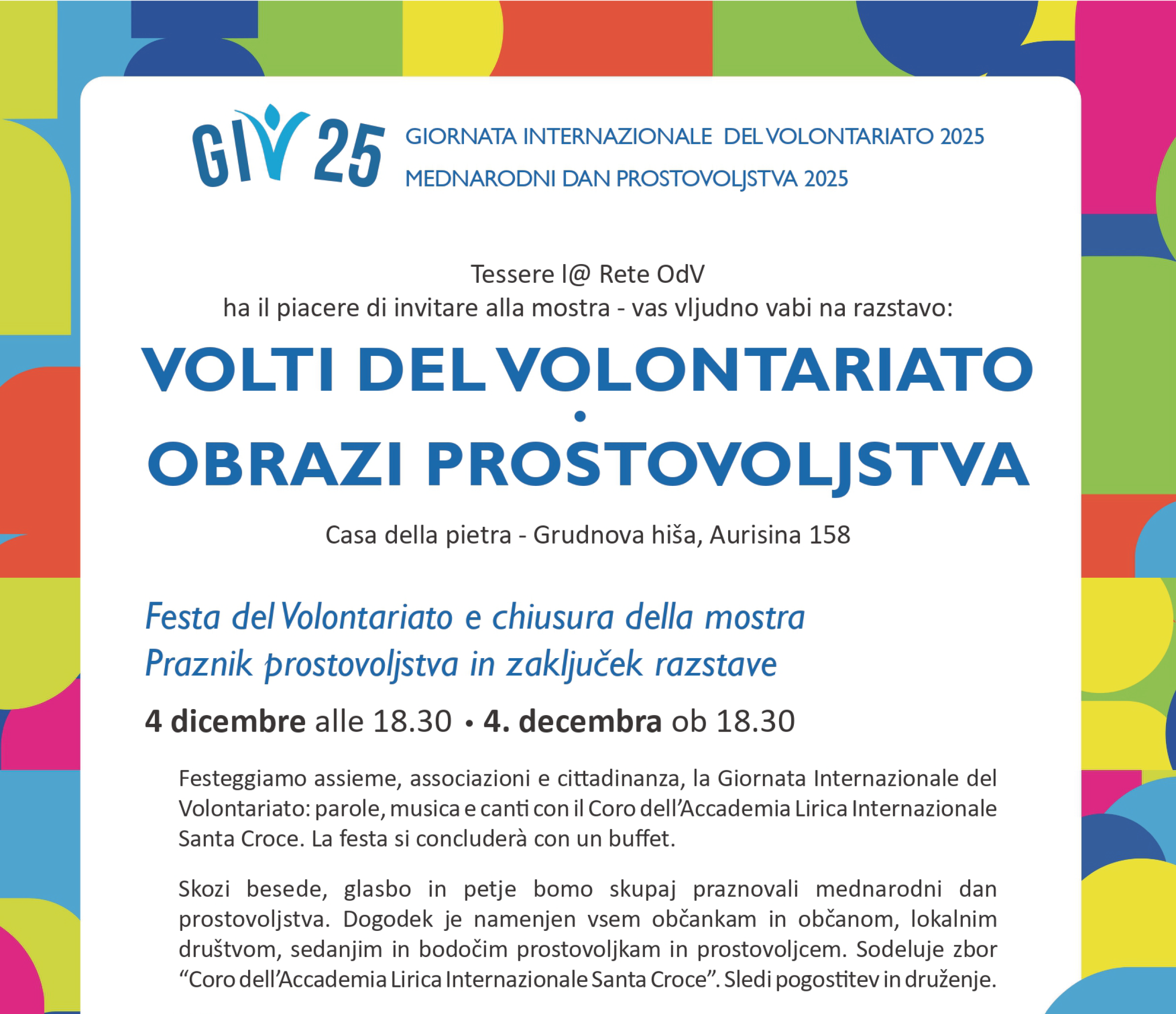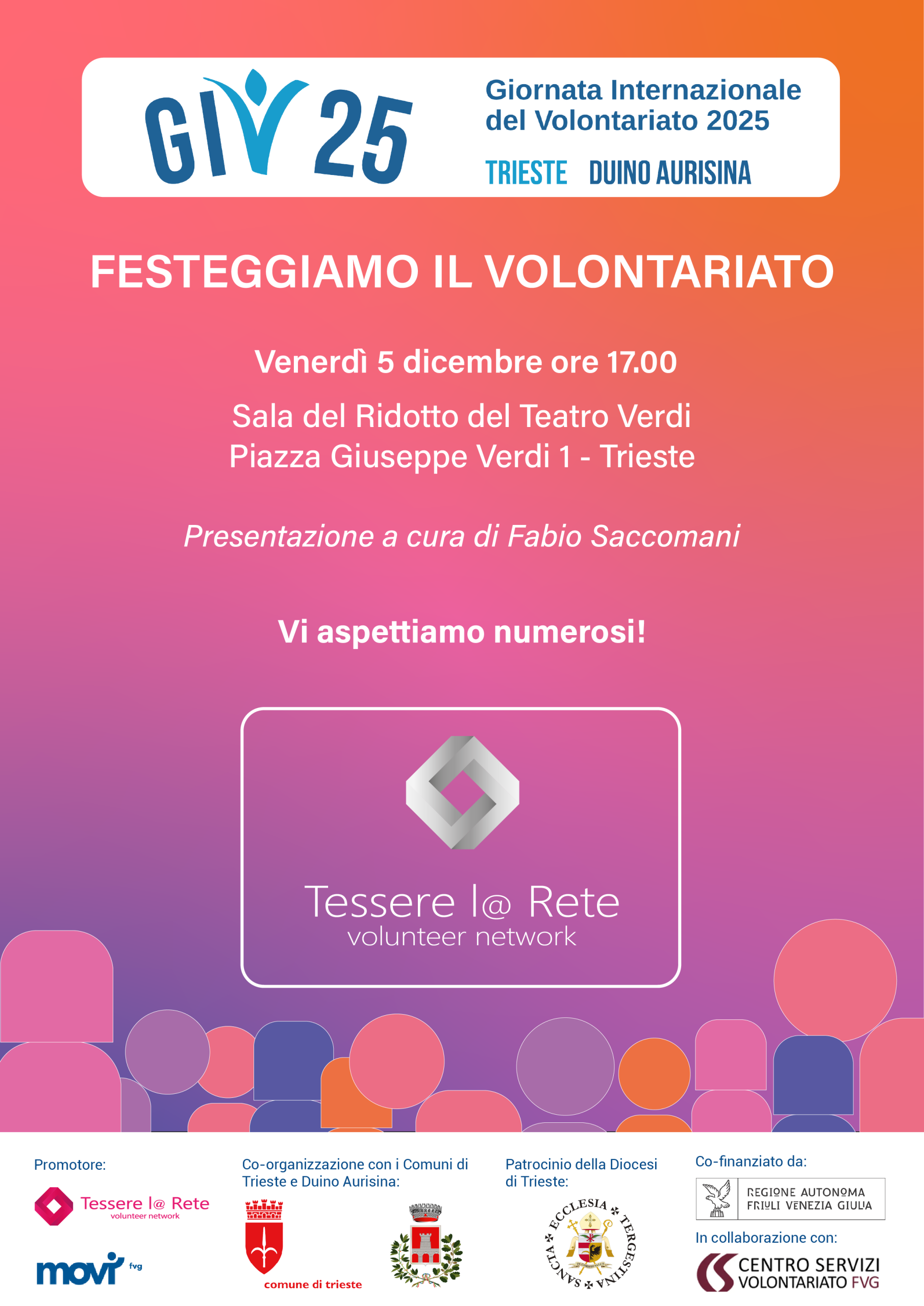 Volontari in Festa per condividere le rotte future del Volontariato triestino, presentare e buone pratiche di volontariato, brevi spettacoli, testimonianze, ed altre manifestazioni artistiche.
